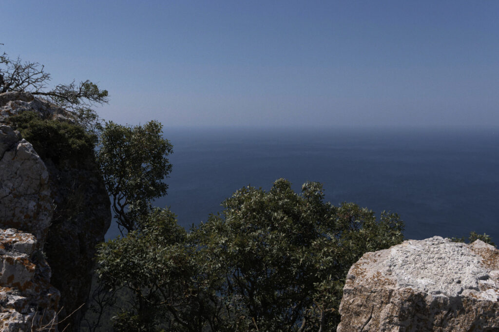 Appena dopo quella macchia selvaggia l’isola si stringe, fino a che i due tratti di mare che la costeggiano sono separati soltanto dalla strada, da una spianata di terra, e da rive scoscese; sì che ci si può fermare e sentirsi quasi completamente avvolti dal blu.